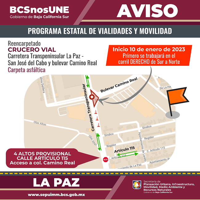 El 10 de enero, la reconstrucción con carpeta asfáltica del bulevar Camino Real, tramo: Esmeralda a calle Amarilla (lado izquierdo de Oriente -Poniente); y la rehabilitación con carpeta asfáltica del crucero carretera Transpeninsular La Paz- San José del Cabo con bulevar Camino Real; es importante destacar que el acceso a la colonia Camino Real será por la calle Artículo 115, con la habilitación de un 4 altos provisional en el cruce con la carretera.