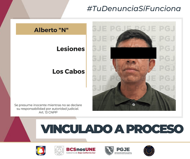 Los datos de prueba presentados por el agente del Ministerio Público de la Unidad de Tramitación Masiva de Casos en San José del Cabo, de la Procuraduría General de Justicia del estado (PGJE), fueron suficientes para relacionar al imputado con el delito de lesiones que probablemente cometió el 25 de enero del 2022, en un domicilio que se ubica en la colonia Ampliación Vista Hermosa, en la San José del Cabo.