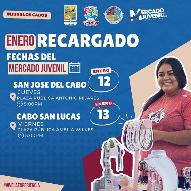 El XIV Ayuntamiento de Los Cabos que preside Oscar Leggs Castro, a través del Instituto de la Juventud del Municipio de Los Cabos (INJUVE), a cargo de Eduardo Gamaliel Valdez Ortiz, invita a la ciudadanía a que asistan al “Mercado Juvenil”, que se llevará a cabo este jueves 12 de enero en San José del Cabo en la plaza pública José Antonio Mijares y el viernes 13 en la delegación de Cabo San Lucas en la plaza pública Amelia Wilkes, a partir de las 5:00 de la tarde.