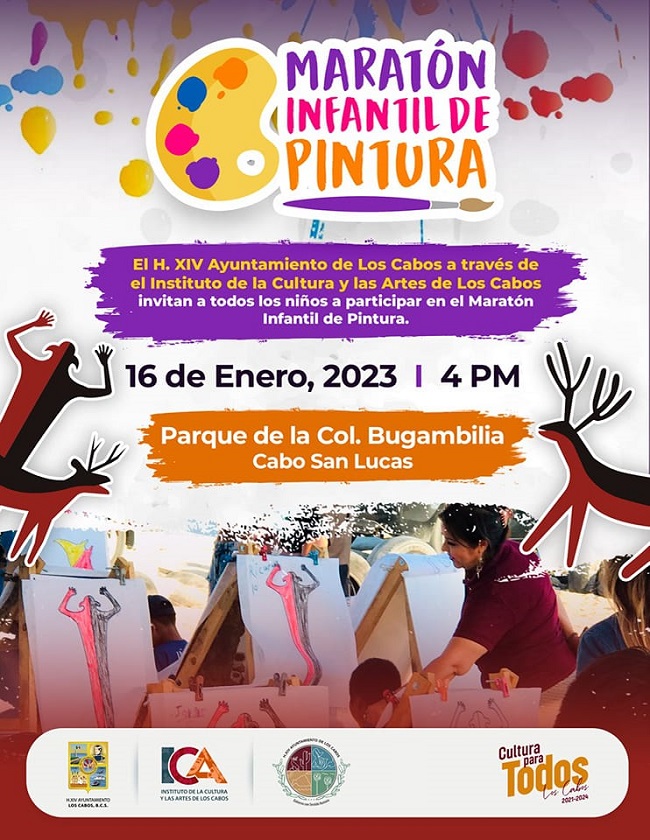 .- El XIV Ayuntamiento de Los Cabos a través del Instituto de la Cultura y las Artes de Los Cabos (ICA), a cargo de Irene Román Salgado, invita a niñas y niños a participar en el “Maratón Infantil de Pintura”, que se llevará a cabo el próximo lunes 16 de enero a las 4:00 de la tarde en la delegación de Cabo San Lucas en el parque público de la colonia Bugambilia.