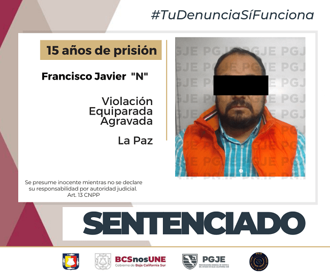 En audiencia de Juicio Oral la Procuraduría General de Justicia del Estado (PGJE), obtuvo del Tribunal de Enjuiciamiento en La Paz, sentencia de 15 años de prisión contra de un sujeto de quien se acreditó la responsabilidad en la comisión del delito de violación equiparada agravada cometido en ofensa de una persona menor de edad.