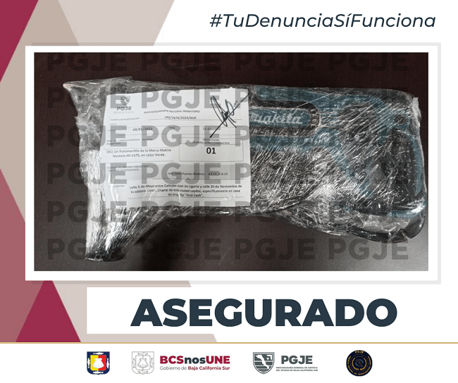 Mediante la cumplimentación de una orden de cateo, concedida por un Juez de Control, agentes de investigación de la Unidad de Imputado Desconocido en la ciudad de La Paz, lograron el aseguramiento de un rotomartillo marca Makita, color verde, el cual está relacionado en una denuncia por el delito de robo.