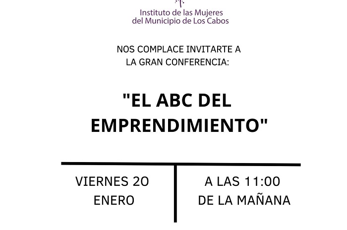 El Instituto de las Mujeres del Municipio de Los Cabos (IMMLC), a cargo de Ma. Del Rosario Díaz Cinco, invita a jóvenes y mujeres de la delegación de Santiago a que asistan y participen en la conferencia “El ABC del Emprendimiento”, se llevará a cabo de manera gratuita el 20 de enero en las instalaciones del Cecyte #03 en la sala audiovisual de la escuela de la delegación de Santiago, dando inicio a las 11:00 de la mañana.