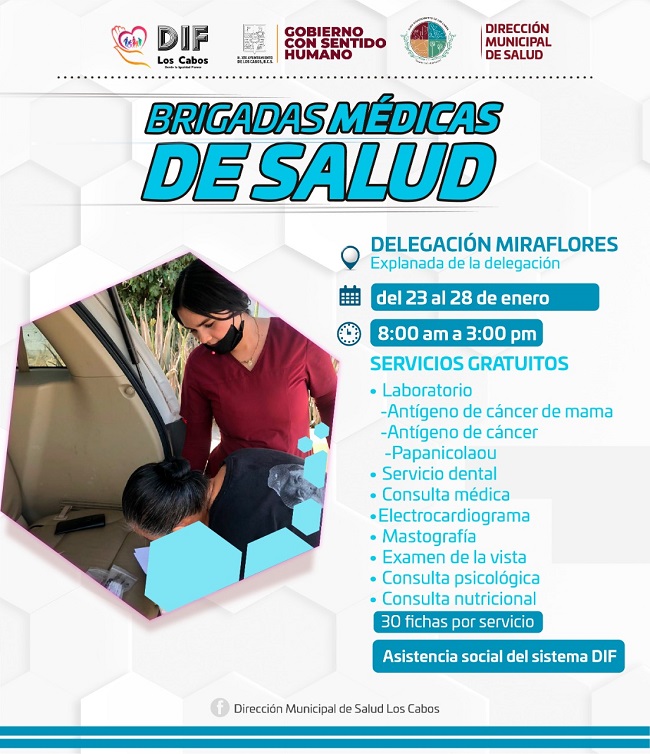 El XIV Ayuntamiento de Los Cabos que preside Oscar Leggs Castro, a través de la Dirección Municipal de Salud a cargo del Dr. Juan Carlos Costich Pérez, invita a la ciudadanía de la delegación de Miraflores a que asistan y aprovechen los servicios de las unidades móviles de las “Brigadas Médicas de Salud”, que se encontrarán hasta el 28 de enero en la explanada de la delegación de Miraflores, con un horario de atención de 8:00 de la mañana a 3:00 de la tarde.