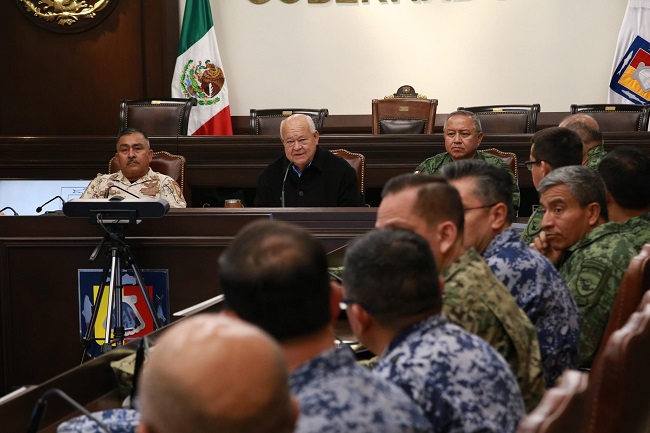 Acompañado por el general de Brigada Andrés Fernando Aguirre Souza, director del Colegio de la Defensa Nacional, el mandatario sudcaliforniano presentó un panorama general de la situación que guardan los cinco municipios de la entidad, y las acciones que continúa su administración para atender rezagos y crear las mejores condiciones para el desarrollo y bienestar de todos.