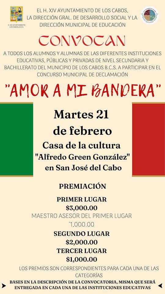 El XIV Ayuntamiento de Los Cabos que preside Oscar Leggs Castro, a través de la Dirección Municipal de Educación, a cargo de Jorge Ernesto Servín Meza, convoca a las y los alumnos de nivel secundaria y bachillerato a participar en el Concurso Municipal de Declamación “Amor a Mi Bandera”, que se llevará a cabo el 21 de febrero a partir de las 9:00 de la mañana en la casa de la cultura “Alfredo Green González” en San José del Cabo.