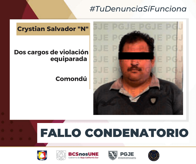 Resultado de la investigación conducida por la Procuraduría General de Justicia del Estado (PGJE) de Baja California Sur se obtuvo fallo condenatorio contra de un hombre por dos cargos de delito de violación equipara agravada en agravio de una menor de edad.