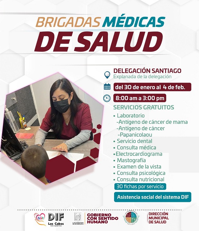 El XIV Ayuntamiento de Los Cabos que preside Oscar Leggs Castro, a través de la Dirección Municipal de Salud, a cargo del Dr. Juan Carlos Costich Pérez, invita a la población de la delegación de Santiago a que hagan uso de las “Brigadas Médicas de Salud “que estarán del 30 de enero al 4 de febrero en la explanada de la Delegación, en un horario de atención de 8:00 de la mañana a 3:00 de la tarde.
