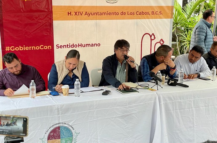 Los Cabos, B.C.S., 31 de enero 2023.- En conferencia de prensa para medios de comunicación, el alcalde Oscar Leggs Castro, acompañado de los regidores de la Comisión de Desarrollo, Urbano, Planeación, Ecología y Medio Ambiente, así como de la síndica municipal Alondra Torres García y del secretario general Ariel Castro Cárdenas, explicó que no existe ninguna privatización en la aprobación del cambio de uso de suelo de un predio privado en Cabo San Lucas y del que forma parte el denominado Cerro de la “Z”, aprobado por mayoría durante la última sesión pública del Honorable Cabildo de Los Cabos.