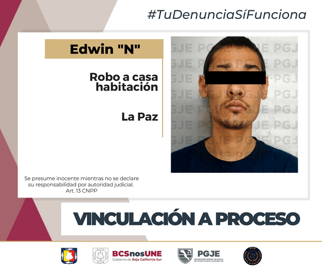 La Procuraduría General de Justicia del Estado (PGJE) de Baja California Sur, obtuvo vinculación a proceso en contra de Edwin “N” alias el Cejitas, a quien se le atribuye su probable participación en un robo a casa habitación en la capital del estado.