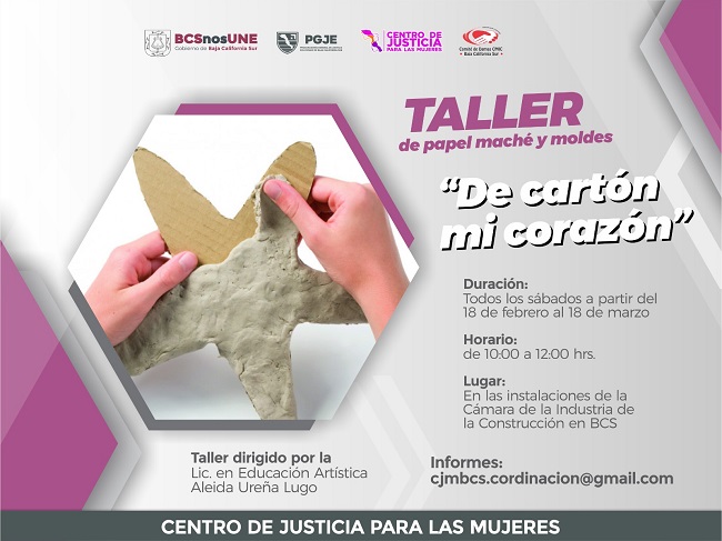 Dicho taller, a cargo de Aleida Ureña Lugo, se realizará de 10:00 a 12:00 horas de los sábados, del 18 de febrero al 18 de marzo, en las instalaciones de la CMIC, ubicadas en calle de Los Constructores esquina Del Pirata, en el fraccionamiento Juárez, en La Paz.