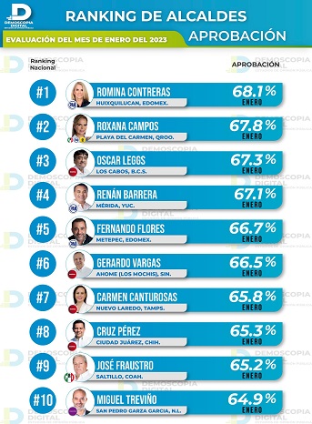 De acuerdo con los resultados del estudio estadístico correspondiente a enero 2023 que desarrolló la empresa Demoscopia Digital, Oscar Leggs Castro se posicionó como el tercer mejor alcalde de México, con una aprobación del 67.3%. El ejercicio de evaluación se basa en formularios que son aplicados de forma mensual a usuarios de la red de mensajería instantánea “WhatsApp”.