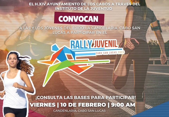El XIV Ayuntamiento de Los Cabos que preside Oscar Leggs Castro, a través del Instituto de la Juventud del Municipio de Los Cabos, a cargo de Eduardo Gamaliel Valdez Ortíz, convoca a las y los jóvenes del ejido La Candelaria en Cabo San Lucas a participar en el “Rally Juvenil Cabo San Lucas 2023”, este viernes 10 de febrero a las 9:00 de la mañana; lo anterior, con el objetivo de promover y fomentar la activación en las y los jóvenes para mejorar su rendimiento físico mediante diversas actividades y desafíos que ayuden a prevenir la obesidad y enfermedades graves.