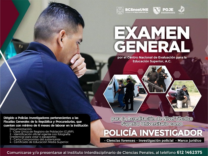 La Procuraduría General de Justicia del Estado (PGJE) de Baja California Sur a través del Instituto Interdisciplinario de Ciencias (IICP), convoca a todo el personal con el perfil de Agente Estatal de Investigación Criminal, a participar en el Examen General para la Acreditación de Nivel Técnico Superior Universitario como Policía Investigador, el cual se lleva a cabo el próximo 2 de abril por parte del Centro Nacional de Evaluación para la Educación Superior, A.C. (CENEVAL).