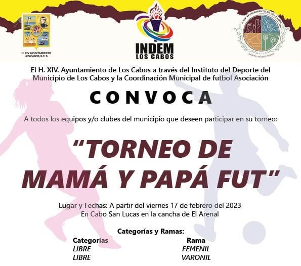 El XIV Ayuntamiento de Los Cabos que preside Oscar Leggs Castro, a través del Instituto del Deporte del Municipio de Los Cabos (INDEM) y la Coordinación Municipal de Fútbol Asociación, convocan a la ciudadanía en general y a todos los equipos y/o clubes del municipio a participar en el “Torneo de Mamá y Papá Fut”, que dará inicio el 17 de febrero en la cancha de fútbol El Arenal en la delegación de Cabo San Lucas.