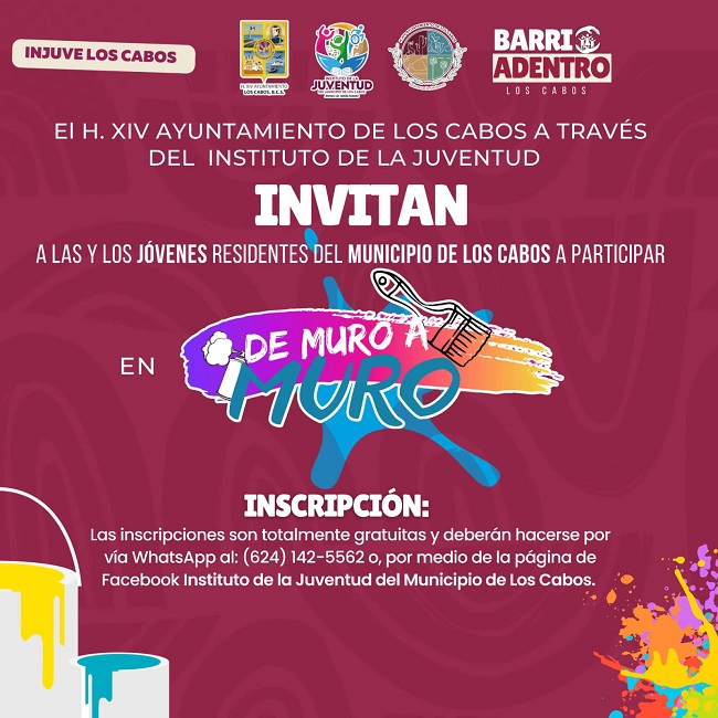 La XIV Administración presidida por Oscar Leggs Castro, a través del Instituto de la Juventud del municipio de Los Cabos (INJUVE), que dirige Eduardo Gamaliel Valdez Ortíz, invita a las y los jóvenes residentes del municipio de Los Cabos a participar en la convocatoria “De Muro a Muro”, cuyo objetivo principal es formar una brigada de jóvenes que les guste el arte del muralismo para plasmar ideas en conjunto en distintas zonas de Los Cabos.