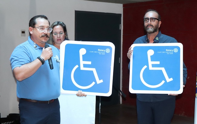 Antes de finalizar el evento, el presidente del Club Rotario Cabo San Lucas del Mar José Acosta Morales, hizo entrega al coordinador del Pabellón Cultural “Nabor García Aguirre” Francisco Rincón Andrade, de señalización que se instalará en espacios destinados para personas con discapacidad.