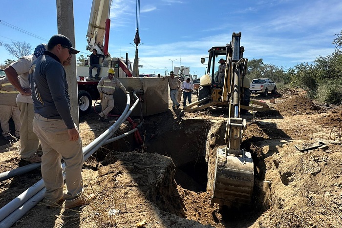 Luego de que se detectara una fuga en el acueducto #2 Cabo Bello-Tanque Mil de Lomas del Sol (a la altura de Sierra Dorada), el equipo del OOMSAPAS que dirige Ismael Rodríguez Piña, en coordinación con la Comisión Federal de Electricidad (CFE), Tránsito Municipal de Los Cabos y la Guardia Nacional, trabajan en la reparación de la fuga para restablecer el servicio de agua potable a las colonias que dependen de esta fuente de vital líquido.