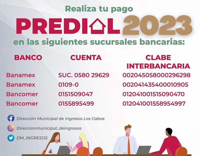 Asimismo, dichos pagos también pueden efectuarse mediante transferencias bancarias en sucursales Banamex y Bancomer, además del portal de internet www.tesoreria.loscabos.gob.mx/pagos-y-consultas/, esto con el propósito de facilitar una forma rápida y sencilla.