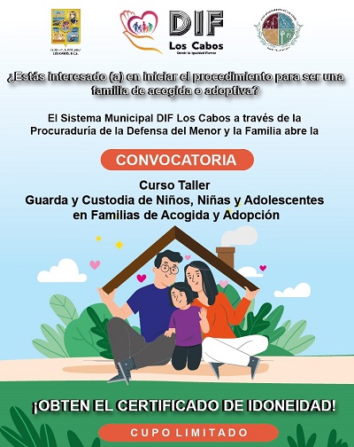 Con el firme propósito de proteger y restituir los derechos de las niñas, niños y adolescentes a tener una familia, el Sistema Municipal DIF Los Cabos a través de la Procuraduría de la Defensa del Menor y la Familia, abre la convocatoria para quienes estén interesados en iniciar el procedimiento para ser una familia de acogida o adopción para el curso-taller “Guarda y Custodia de Niños, Niñas y Adolescentes de Acogida y Adopción” que se estará impartiendo con cupo limitado a 20 parejas, el 10 y 11 de marzo, donde podrán obtener su certificado de idoneidad.