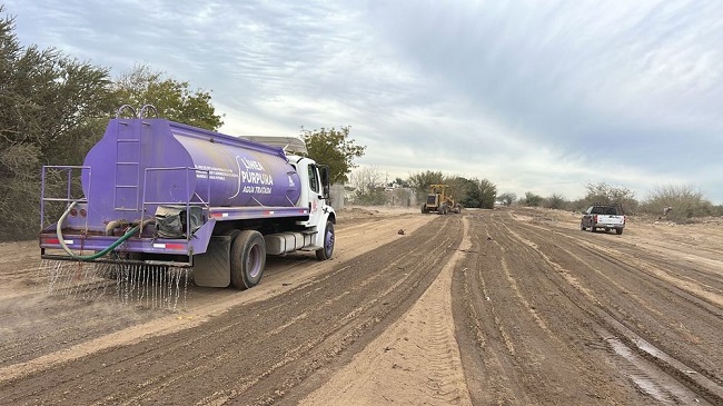 Añadió además que específicamente en la calzada El Bledal, se está utilizando una motoconformadora y una pipa con agua tratada, a través de la pipa púrpura, para nivelar y regar la zona, labor que se realiza también en los otros caminos vecinales.