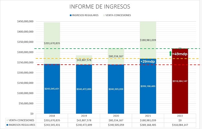Los ingresos por venta de concesiones no se consideran como parte del ingreso regular porque son pagos únicos que varían de acuerdo al tipo de concesión y magnitud del proyecto; por ejemplo, en 2018 se obtuvieron 201 mdp, en 2019 por 43 mdp, 2020 por 80 mdp y en 2021 por 180 mdp, mientras que en 2022 este rubro se reportó en cero, simplemente porque no dejaron áreas susceptibles a desarrollar.