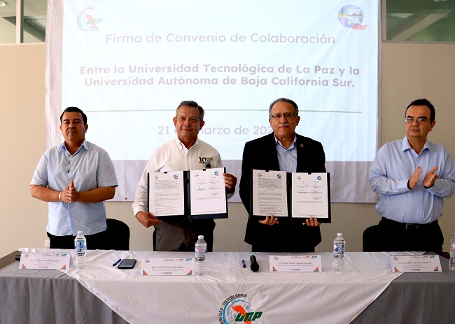 Los rectores de las universidades Autónoma de Baja California Sur (UABCS) y Tecnológica de La Paz (UTLP), Dr. Dante Salgado González e Ing. Rodolfo Pimentel González, respectivamente, celebraron la firma de un convenio de colaboración para estrechar las redes de trabajo conjunto a través de diferentes proyectos y programas institucionales.