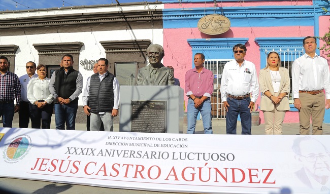 Este lunes 27 de marzo el alcalde de Los Cabos Oscar Leggs Castro, tuvo a bien encabezar la ceremonia por el aniversario luctuoso del profesor Jesús Castro Agúndez, evento que se desarrolló en el marco del acto cívico de honores a la bandera efectuado en la explanada frente al Palacio Municipal en San José del Cabo.