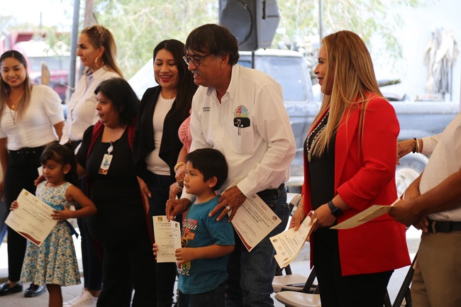 Como parte de las acciones comprometidas dentro del Plan de Desarrollo Municipal 2021-2024 del XIV Ayuntamiento de Los Cabos, la tarde de este 21 de junio el presidente municipal de Los Cabos Oscar Leggs Castro en compañía de su esposa y presidenta del SMDIF Flora Aguilar de Leggs, hizo entrega de la documentación que avala la participación de 405 personas que accedieron a las capacitaciones y talleres con valor curricular que otorga el Centro de Desarrollo Comunitario (CDC) en la colonia Mesa Colorada de Cabo San Lucas.