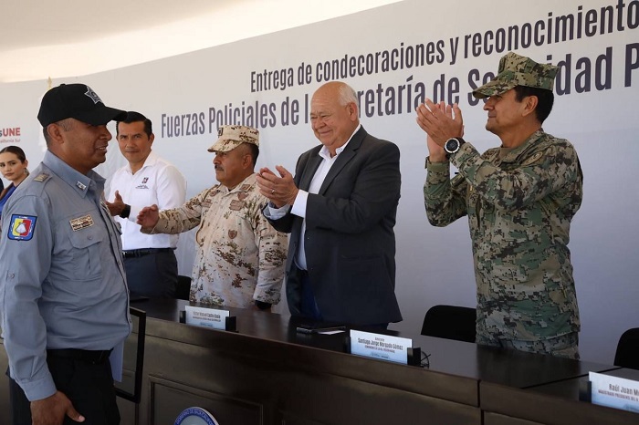 Acompañado por el secretario de Seguridad Pública, Luis Alfredo Cancino Vicente, de los representantes de los poderes Legislativo y Judicial, así como de las Fuerzas Armadas y de la Guardia Naional, el Gobernador entregó reconocimientos por 10, 15, 20 y 25 años de servicio a 222 elementos; 112 pertenecientes a la Secretaría de Seguridad Pública y 110 penitenciarios. Además, se destacó a 17 servidores en base a su desempeño y servicio a la comunidad. En evento que se llevó a cabo en la explanada de la Secretaría de Seguridad Pública, el Gobernador dijo que: “no solamente les reconocemos, no solamente les condecoramos por su entrega y amor a un trabajo tan difícil”, ante lo que se gestionará para otorgar un bono económico de acuerdo con la antigüedad de cada uno o una de los servidores.