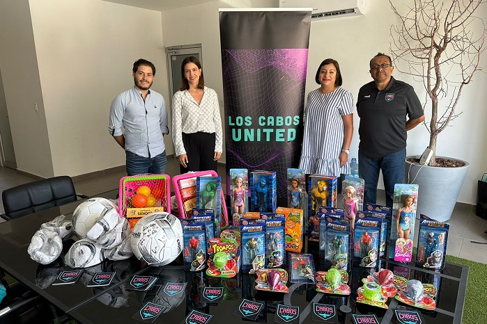 Los Cabos, B.C.S., 28 abril 2023.- Con el objetivo de unir esfuerzos para poder entregar un número significativo de regalos a las niñas y niños de Los Cabos este Día de la Niñez, la coordinadora municipal de Relaciones Públicas del SMDIF Los Cabos, María Fernanda Andrade Palacio, acudió en representación de la presidenta honoraria, Flora Aguilar de Leggs, a la entrega de 29 juguetes, 2 balones autografiados por el jugador El Pony Ruiz y 18 mini balones, donados por el equipo de fútbol Los Cabos United.