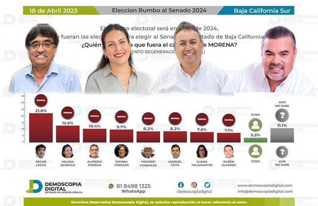 DEMOSCOPIA DIGITAL apuntaal interior de MORENA, las preferencias sobre quién les gustaría que fuera el candidato al Senado, y se indica que OSCAR LEGGS CASTRO registra una preferencia del 21.8%, MILENA QUIROGA ROMERO 12.6%, ALFREDO PORRAS DOMÍNGUEZ 10.4%, YANSSÉN WEICHSELBAUM 9.7%, HOMERO GONZÁLEZ 8.2%, MANUEL COTA CÁRDENAS 8.2%, ILIANA TALAMANTES HIGUERA 7.6% y RUBÉN MUÑOZ ALVAREZ 7.1%.