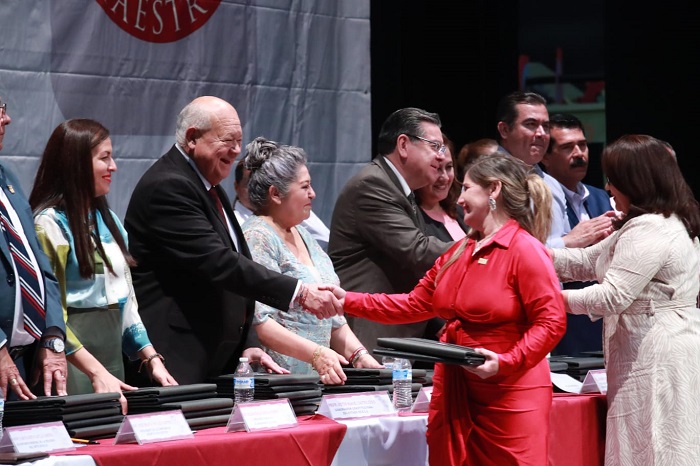 El Ejecutivo estatal acompañó a los maestros desde temprana hora acudiendo a un desayuno, para más tarde estar presente en la Rotonda de los Sudcalifornianos Ilustres donde descansan los restos mortales de destacados docentes y finalmente, en el Teatro de la Ciudad, en donde se hizo entrega de reconocimientos y estímulos económicos a 216 educadores y educadoras que cumplieron 28, 30 y 40 años de servicio.