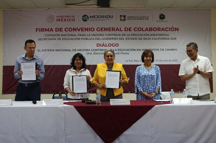 La SEP de Baja California Sur signó este martes, en la sala audiovisual de La Benemérita Escuela Normal Urbana “Profr. Domingo Carballo Félix”, el Convenio General de Colaboración con la Comisión Nacional para la Mejora Continua de la Educación (MEJOREDU), cuyas acciones impactarán en más de 180 mil estudiantes de los niveles básico y medio superior, informó la titular de la dependencia estatal, Alicia Meza Osuna.