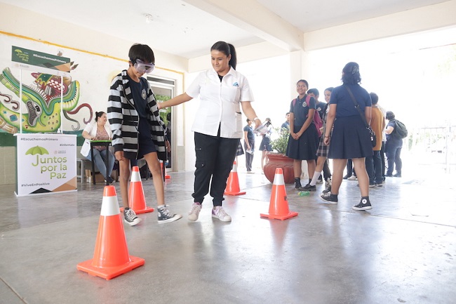 En esta visita se realizó una actividad interactiva en la que las alumnas y alumnos se colocaron unas gafas modificados para provocar una alteración en la vista de las personas, con la finalidad de mostrarles cómo se limita su percepción de riesgo y de concentración cuando ingieren bebidas alcohólicas en exceso, señaló la médica.