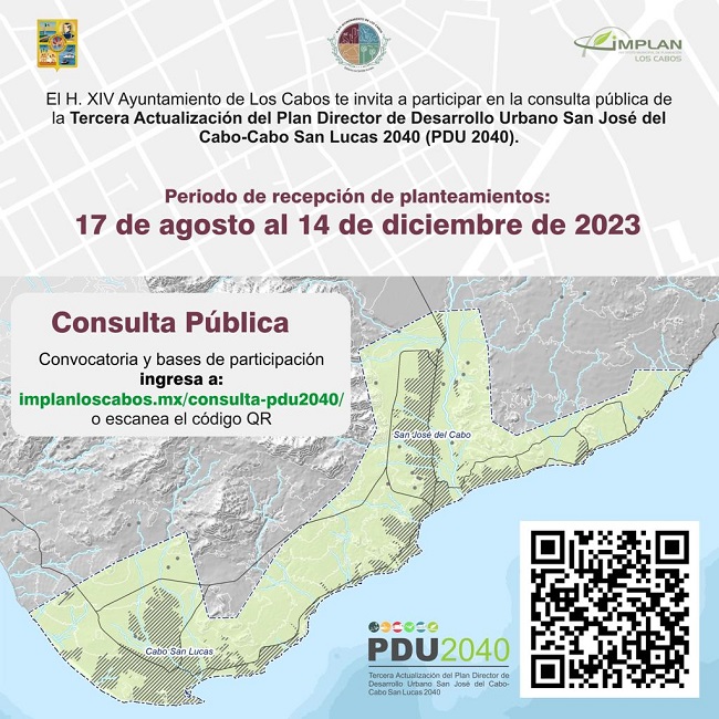 Con el interés de fortalecer los mecanismos de participación incluyente, equitativa, corresponsable y efectiva de todos los sectores de la sociedad en la planeación integral y con visión de largo plazo del municipio, el XIV Ayuntamiento de Los Cabos tiene el honor de invitar a la ciudadanía a participar en el proceso de consulta pública de la Tercera Actualización del Plan Director de Desarrollo Urbano San José del Cabo-Cabo San Lucas 2040 (PDU 2040).