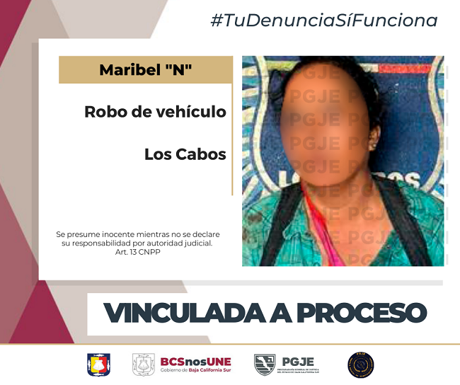 Por los datos de prueba presentados por el agente del Ministerio Público, un Juez de Control vinculó a proceso a una mujer identificada como Maribel “N”, por el delito de robo de vehículo de motor, por hechos ocurridos en Cabo San Lucas.