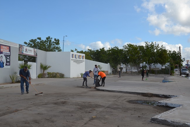 Entre los trabajos que se llevaron a cabo fueron recolección de basura, poda de árboles y arbustos, recolección de tierra acumulada y maleza, barrido de banquetas y área cívica, salones de clases, limpieza de vidrios, desinfección de áreas comunes, etc.