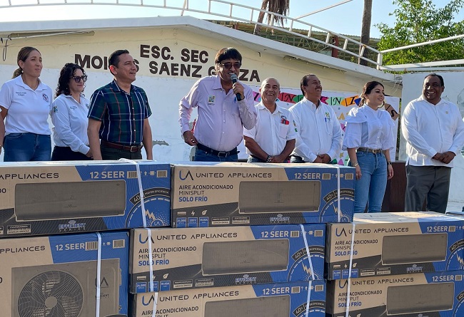 En punto de las 7:00 de la mañana en la explanada de la que fue su escuela secundaria en sus años de estudiante, el alcalde acompañado del diputado local Juan Pérez Cayetano, del III regidor Fabián Ceseña Ceseña, de la directora de Atención Ciudadana Dina De La Paz Araiza, así como de la presidenta de la sociedad de padres de familia Alejandra Rodríguez Medina, recordó que durante la clausura del ciclo anterior se hizo entrega de los primeros 3 equipos, sin embargo, viendo la necesidad que tiene la escuela, regresa a entregar 15 para que todos los salones tengan aire y puedan iniciar de la mejor manera.