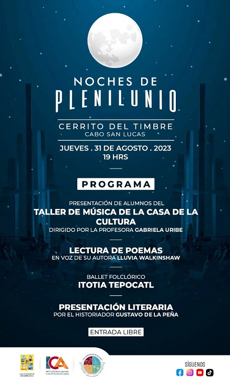 Mañana jueves 31 de agosto, a partir de las 07:00 de la tarde, el Gobierno de Los Cabos a través del Instituto de la Cultura y las Artes de Los Cabos (ICA), desarrollará el evento Noches de Plenilunio en la explanada del Cerrito del Timbre en Cabo San Lucas, así lo informó el coordinador de la Casa de la Cultura Nieves Trasviña en Cabo San Lucas, Luis Ángel Ortiz Catalán, quien hizo extensiva la invitación a la ciudadanía en general.