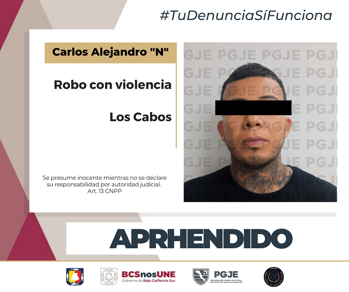 El hombre, identificado como Carlos Alejandro “N” de 31 años y originario de Guadalajara, Jalisco, fue trasladado a la ciudad de Cabo San Lucas donde fue certificado y puesto a disposición de la autoridad judicial que lo requirió, quien definirá su situación jurídica.