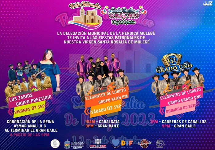La Delegación Municipal de Heroica Mulegé invita a la ciudadanía a acudir a las Fiestas Patronales de la comunidad, que tendrán lugar del 1 al 3 de septiembre en la cancha de usos múltiples.