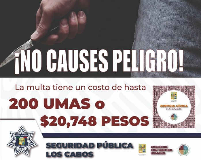 Dando cumplimiento a la encomienda del alcalde Oscar Leggs Castro de mantener la paz y la seguridad en el municipio de Los Cabos, la Dirección General de Seguridad Pública, Policía Preventiva y Tránsito Municipal a cargo del Ing. Jesús Antonio Gómez Rodríguez hace un llamado a la población a no portar armas blancas en la vía pública.