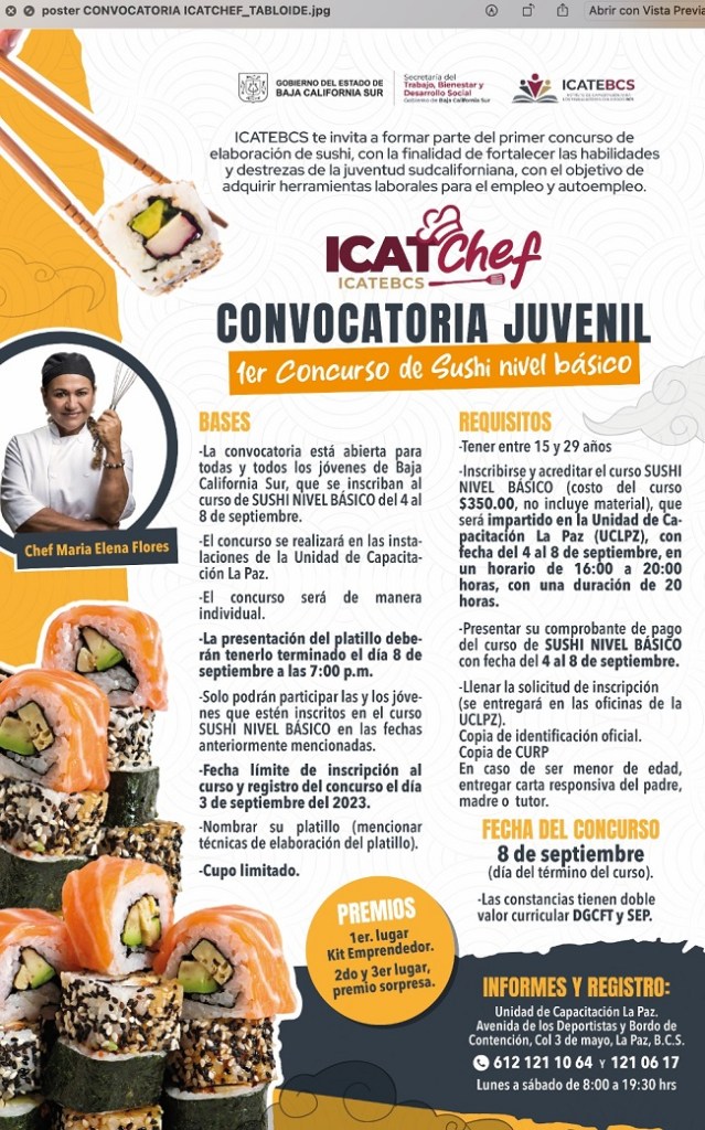 El Instituto de Capacitación para los Trabajadores del Estado de BCS (ICATEBCS), dentro del marco del mes de la juventud, invita a todos las y los jóvenes de entre 15 a 29 años a formar parte del primer concurso de elaboración de sushi nivel básico, así lo comunicó la directora general, Cinthya Fátima Montufas Chávez.