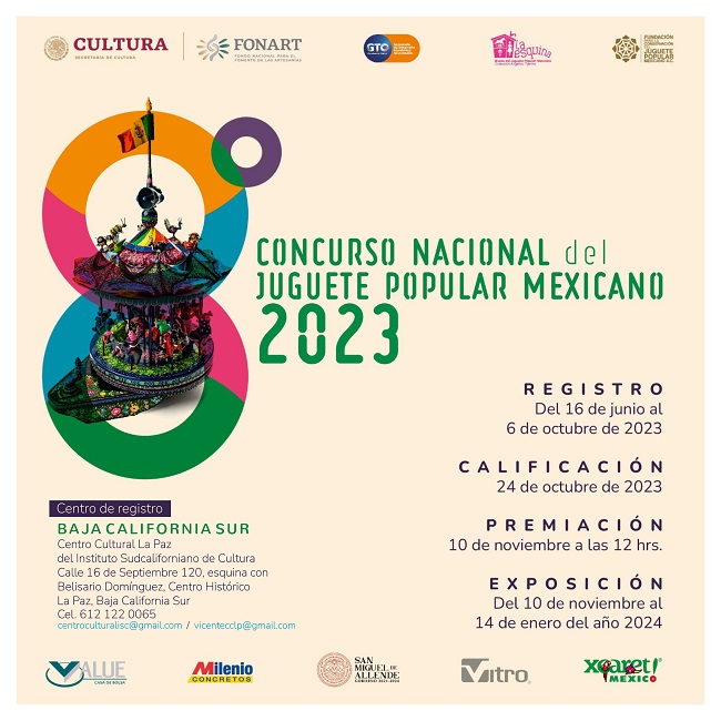 La Secretaría de Cultura Federal a través del Fondo Nacional para el Fomento de las Artesanías, FONART, el Gobierno del Estado de Guanajuato a través de la Dirección de Atención a la Cadena Productiva Artesanías e industrias en Desarrollo, el H. Ayuntamiento Municipal de San Miguel de Allende; la Fundación para la Conservación del Juguete Popular Mexicano A.C., y el Museo del Juguete Popular Mexicano, convocan al 8o Concurso Nacional del Juguete Popular Mexicano 2023.
