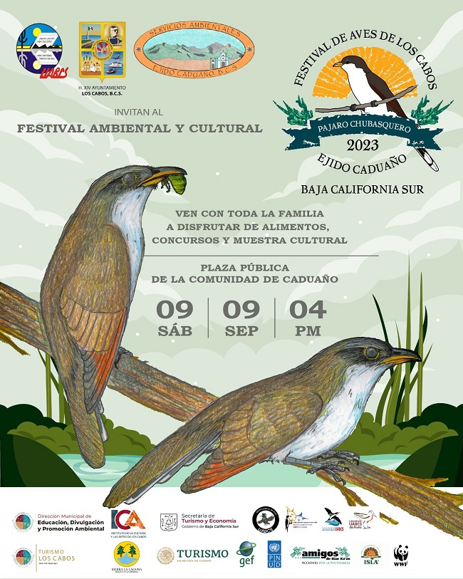 El XIV Ayuntamiento de Los Cabos que preside Oscar Leggs Castro, invita a la la población a disfrutar del Festival de Aves de Los Cabos que se desarrollará este sábado 09 de septiembre en la plaza pública de la comunidad de Caduaño, a partir de las 4:00 de la tarde.