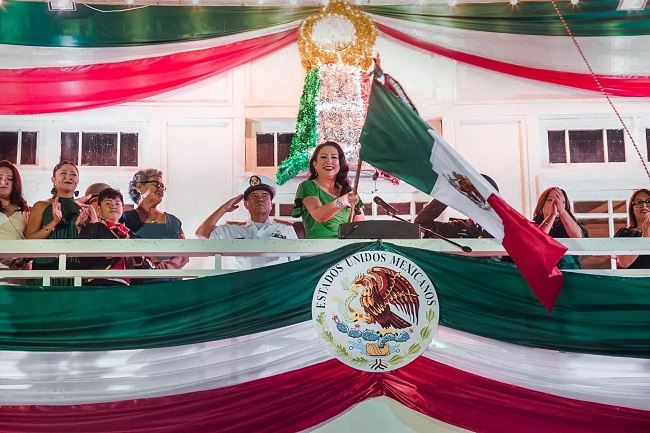 La alcaldesa de Mulegé, Edith Aguilar Villavicencio, subió al balcón de palacio municipal para dar día el tradicional “Grito” en conmemoración del 213 Aniversario del inicio de la Independencia de México.