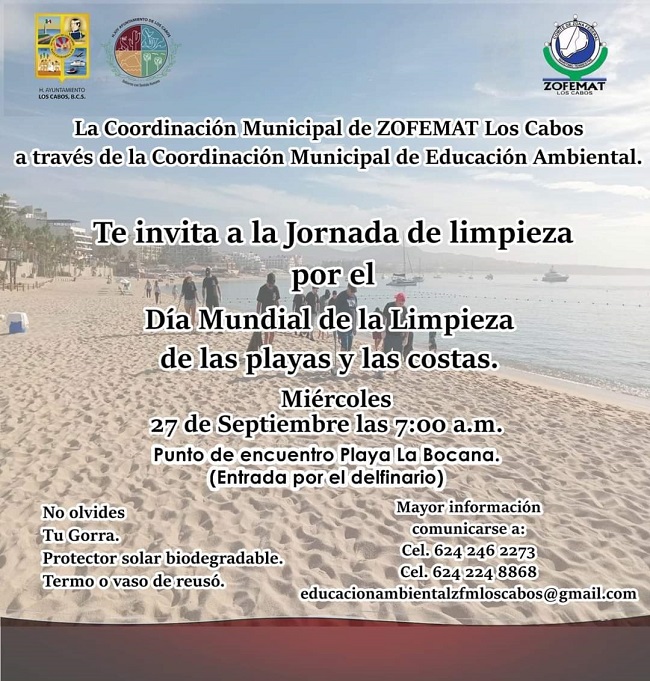 El Gobierno de Los Cabos que preside Oscar Leggs Castro, a través del la Coordinación Municipal de la Zona Federal Marítimo Terrestre (Zofemat) encabezada por Jorge Alonso Meza Núñez, invita a la población en general a sumarse a la campaña de aseo que se realizará para celebrar el Día Mundial de la Limpieza de Las Playas y Las Costas.