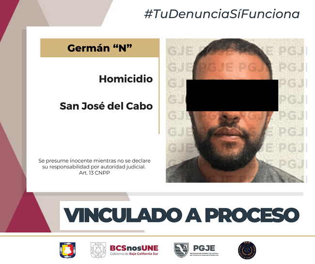 En la continuación de audiencia inicial por orden de aprehensión que se efectuó el lunes 25 del mes en curso en el Centro de Justicia Penal de San José del Cabo, Germán Alberto “N”, quedó formalmente vinculado a proceso y permanecerá en prisión el tiempo que dure dicho proceso, imputado por el delito de homicidio calificado con saña en agravio de quien en vida llevara el nombre de Guillermo “N”.
