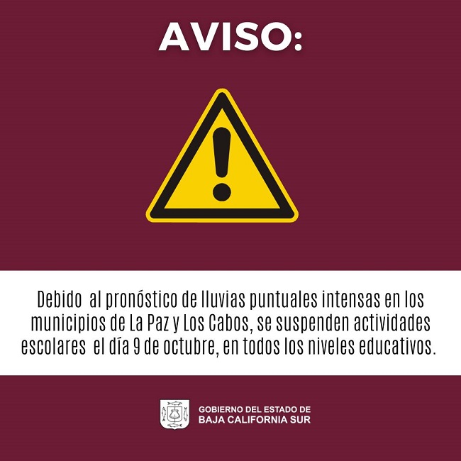 Como medida preventiva, por determinación de los Consejos Municipales de La Paz y Los Cabos, acordaron la suspensión de clases para ambos municipios, tanto en el turno matutino como vespertino, en todos los niveles del sector público y privado, informó el secretario General de Gobierno, Homero Davis Castro.